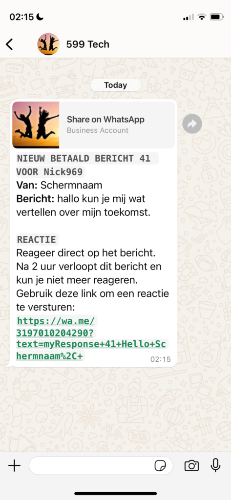 Wanneer een klant een bericht stuurt, ontvangt de agent dit op een van de hierboven genoemde methoden op het WhatsApp-nummer +3197010204290.