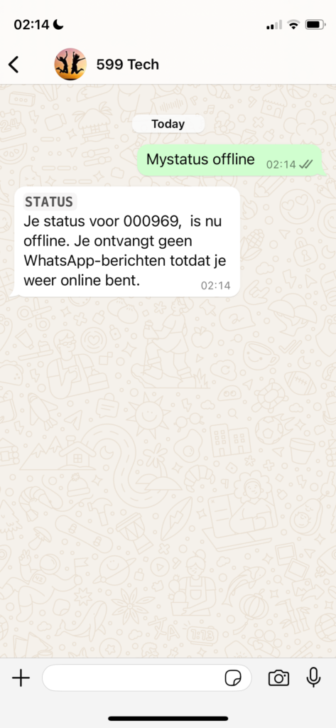 Om de status van WhatsApp op offline te zetten, stuurt de agent het volgende bericht via een van de hierboven genoemde methoden naar +3197010204290: myStatus offline