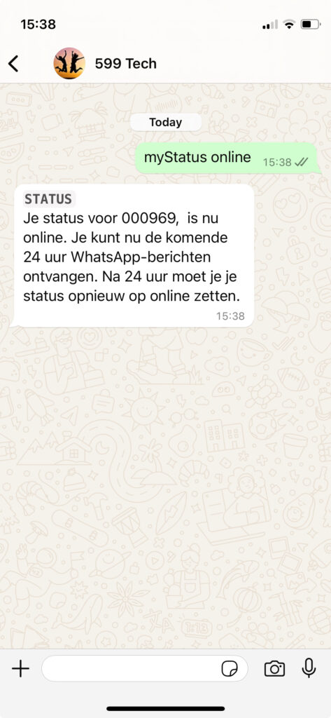 Om de status van WhatsApp op online te zetten, stuurt de agent het volgende bericht via een van de hierboven genoemde methoden naar +3197010204290: myStatus online