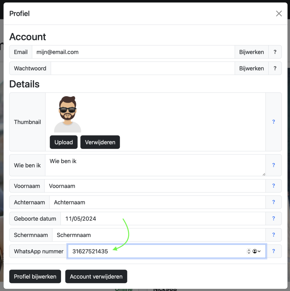 1. Vul in het veld voor WhatsApp-nummer je nummer in. Let erop dat je begint met de landcode zonder + of 00 voor het nummer. Daarna je 06 nummer waarbij de 0 van het 06 nummer komt te vervallen. Dit is belangrijk, omdat het je straks verbindt met de mediums via WhatsApp – geen gedoe, gewoon lekker direct.