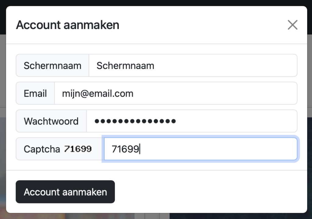 3. Vul de captcha in (die getallen onderaan), klik op Account aanmaken, en voilà – je hebt nu een gratis account!