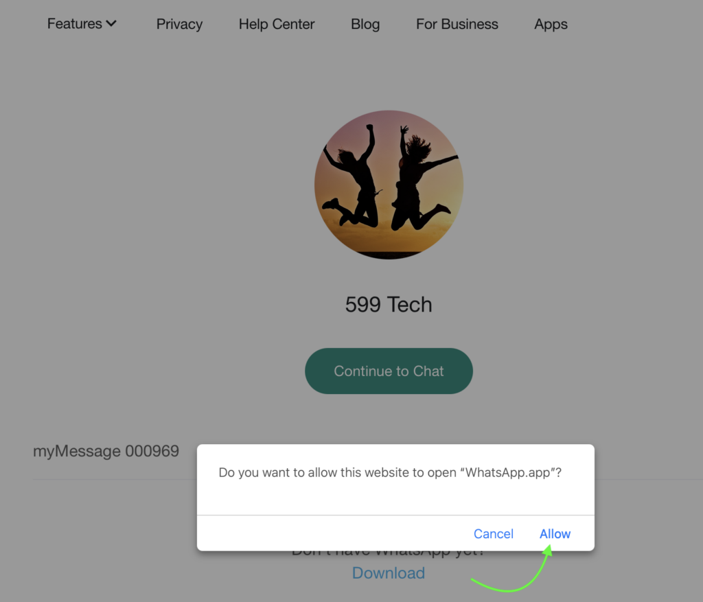1. Je wordt naar WhatsApp geleid. Zorg ervoor dat je de prompt Allow (Toestaan) aanklikt om de chat te openen.